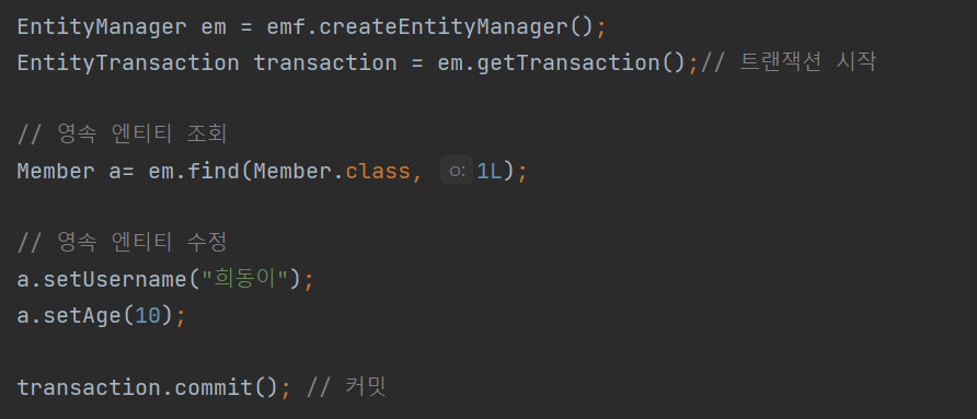 -> 커밋 시점에 업데이트가 되기 때문에 데이터 수정 이후 commit만 해주면 된다.