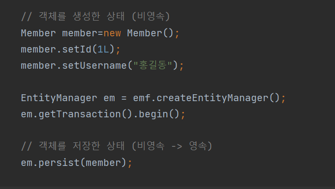 - DB에 실제적인 저장이 아닌 엔티티를 영속성 컨텍스트에 저장하는 것이다.