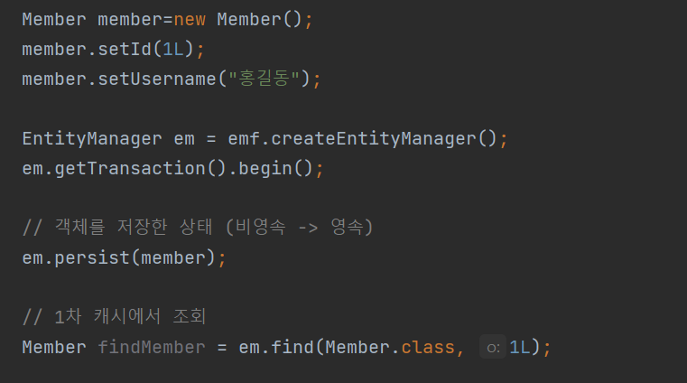 -> 아래와 같이 em.find()를 통해 조회시 우선적으로 1차 캐시에서 찾는다.